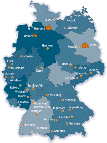 Nordrhein-Westfalen Niedersachsen Niedersachsen Saarland Rheinland-Pfalz Baden-Württemberg Bayern Hessen Sachsen Thüringen Sachsen-Anhalt Brandenburg Brandenburg Schleswig-Holstein Mecklenburg-Vorpommern Bremen Hamburg Berlin