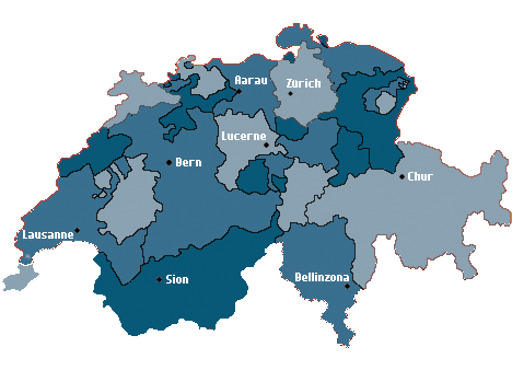 Genf Tessin Graubünden Appenzell Inner-Rhoden Appenzell Ausser-Rhoden Sankt Gallen Sankt Gallen Uri Obwalden Obwalden Nidwalden Glarus Schwyz Wallis Waadt Waadt Freiburg Bern Bern Neuenburg Jura Solothurn Basel-Landschaft Thurgau Zürich Zug Luzern Aargau Schaffhausen Schaffhausen